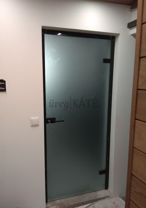 Beltéri ajtó fekete kerettel és szerelvényekkel