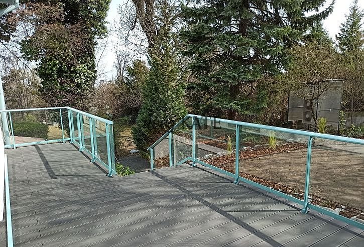 A képen látható üvegkorlát egyedi színre szinterezett Barandilla oszlopos korlátrendszer felhasználásával készült.